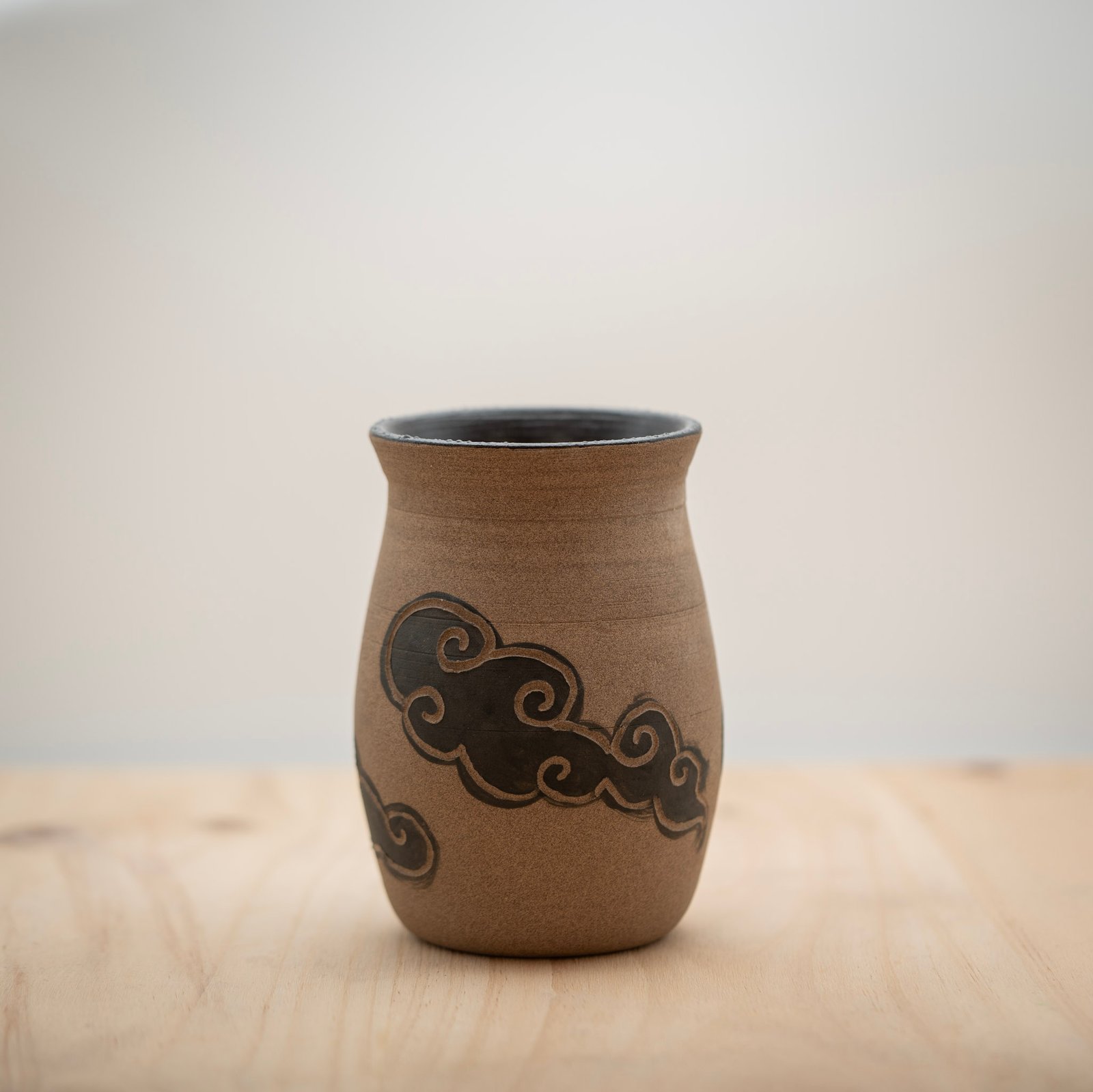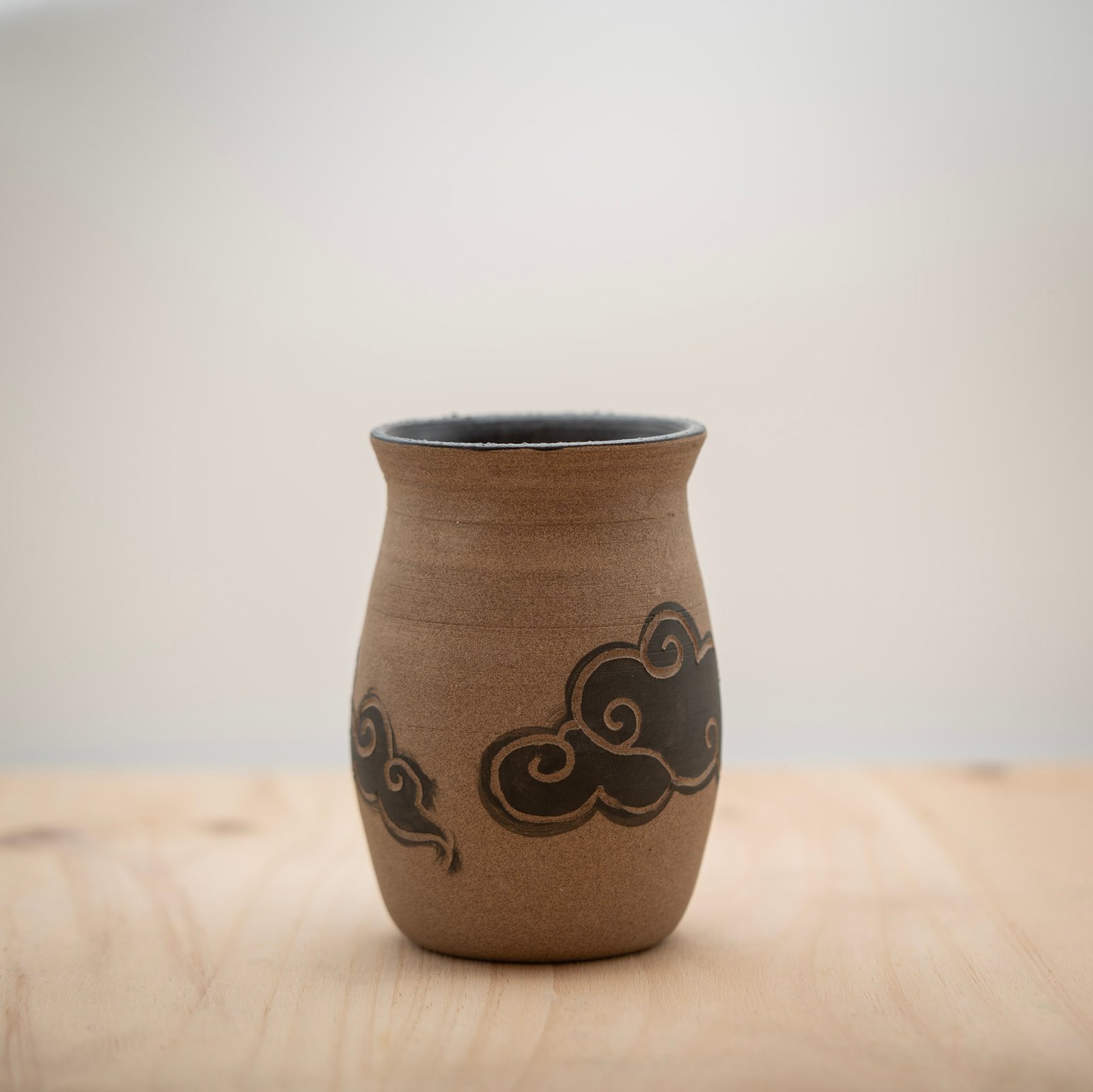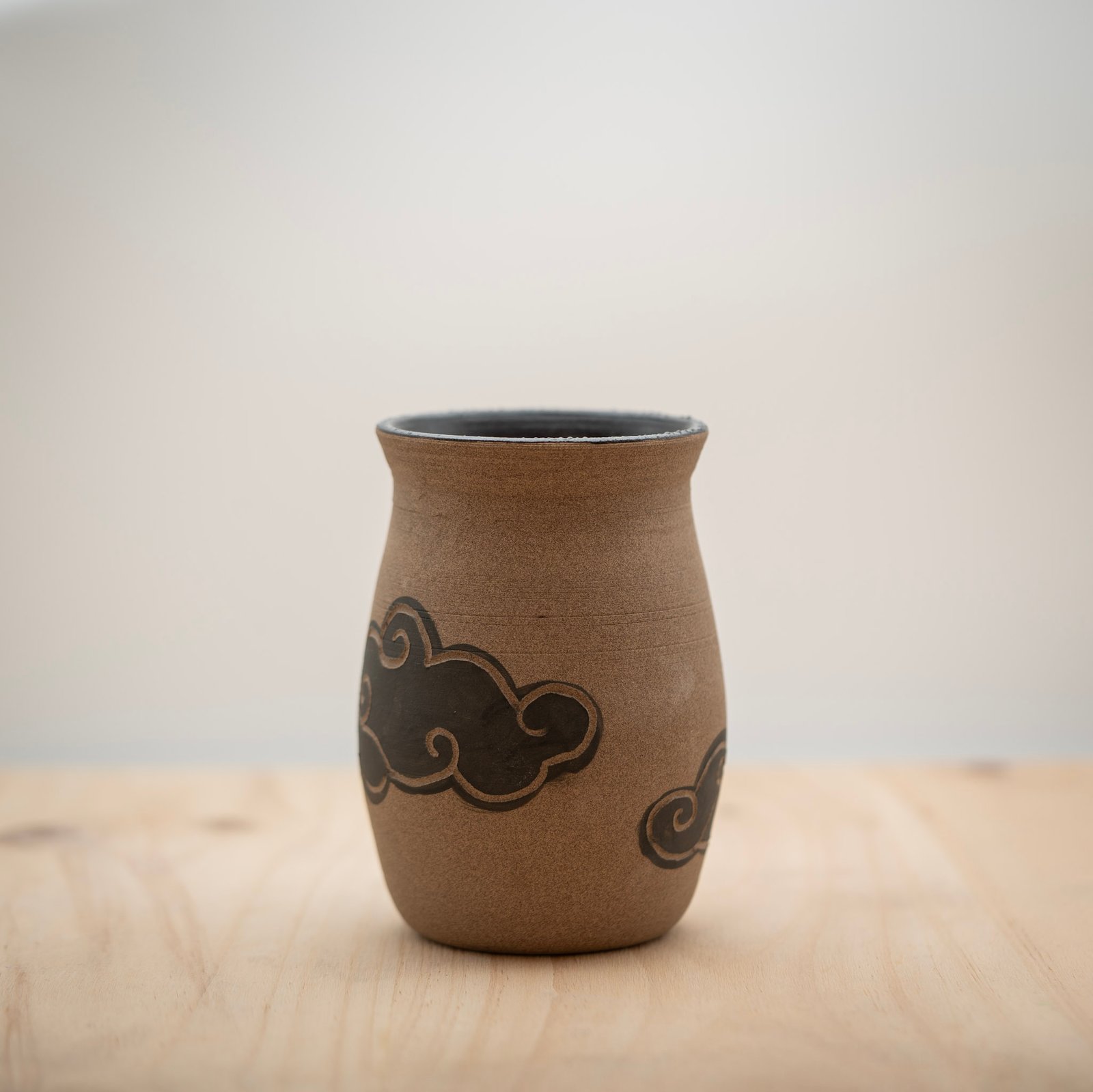 Este jarrón lo realizamos al torno con arcilla refractaria Toffee. Lo decoramos a mano mediante la técnica del esgrafiado, con un motivo de nubes negras característico del estilo Kosy Nubes. Dejamos el exterior sin esmaltar y esmaltamos el interior con un negro brillante.