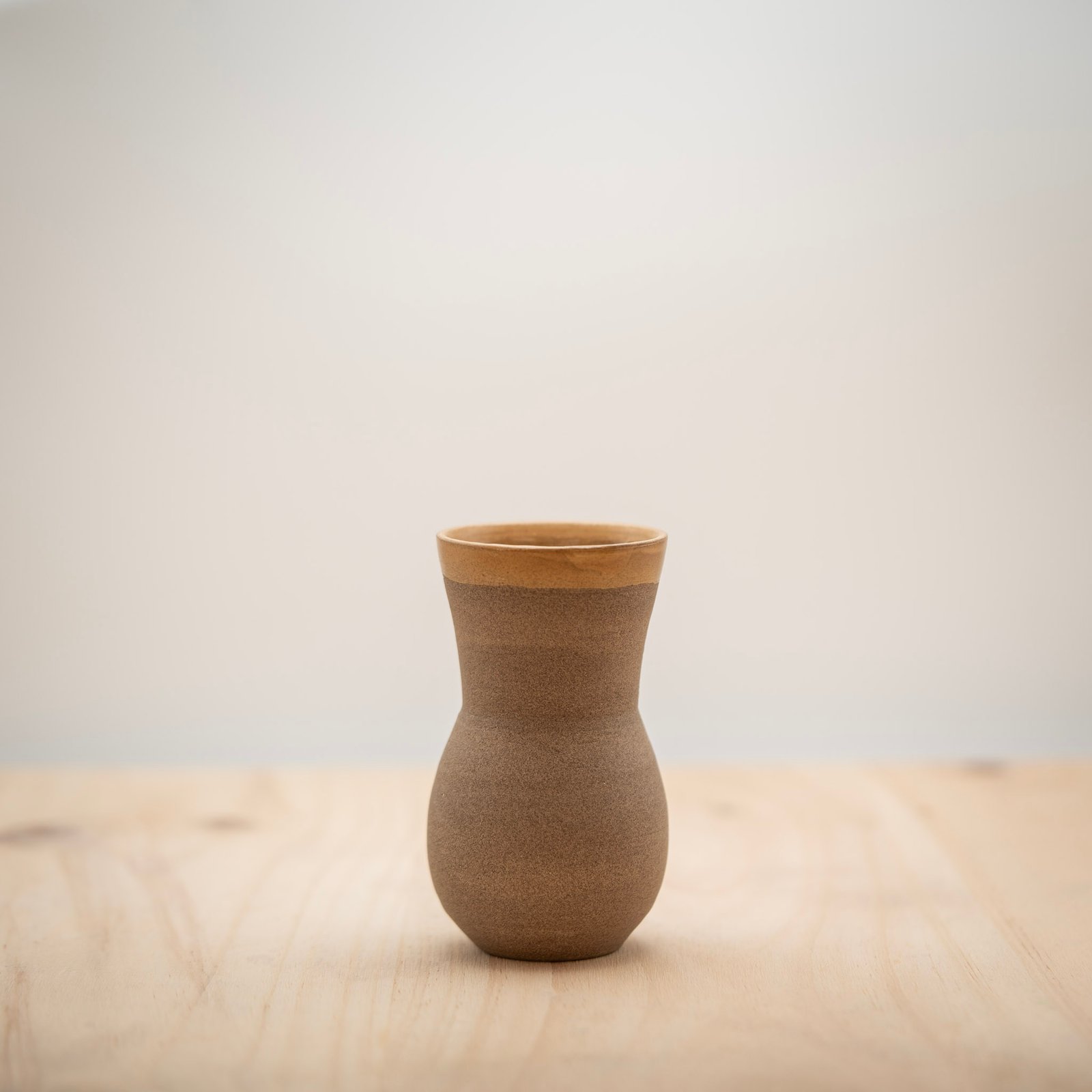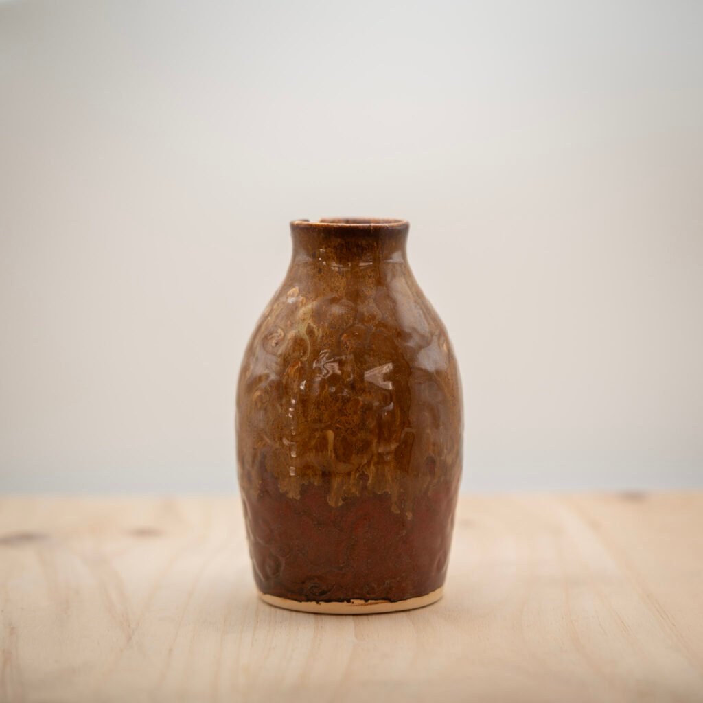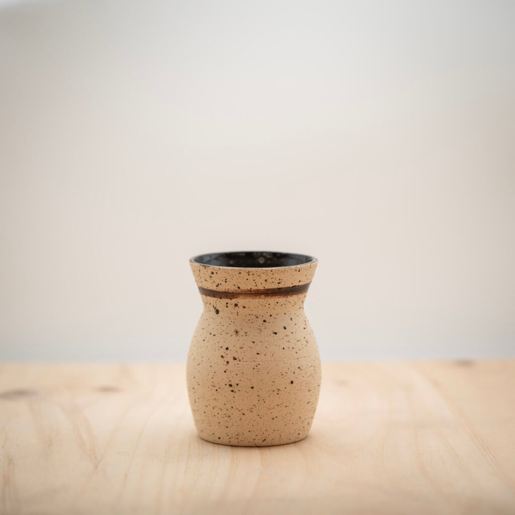 Este jarrón lo realizamos al torno con arcilla refractaria Toffee. Esmaltamos el interior y la parte superior con un esmalte amarillo.