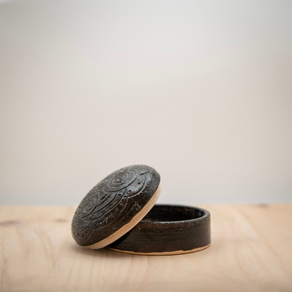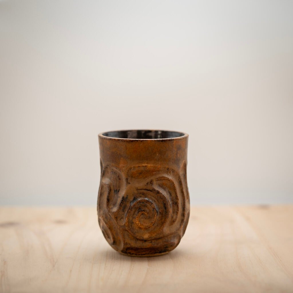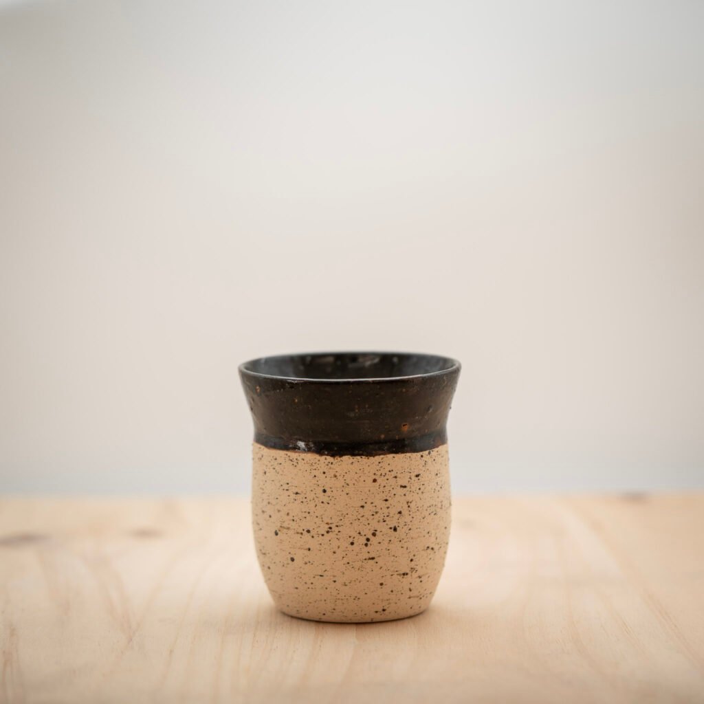 Este jarrón lo realizamos al torno con arcilla refractaria Toffee. Esmaltamos el interior y la parte superior con un esmalte amarillo.