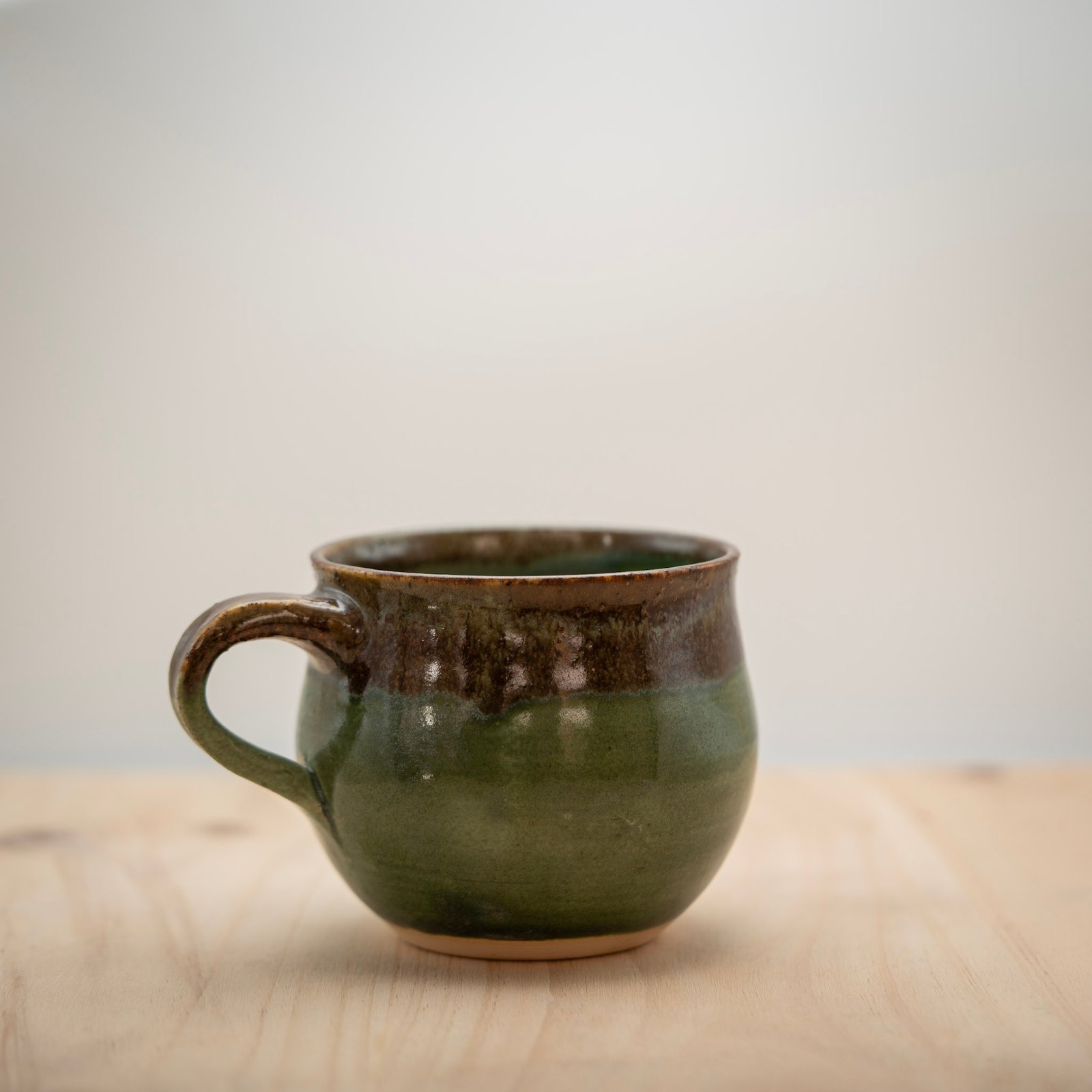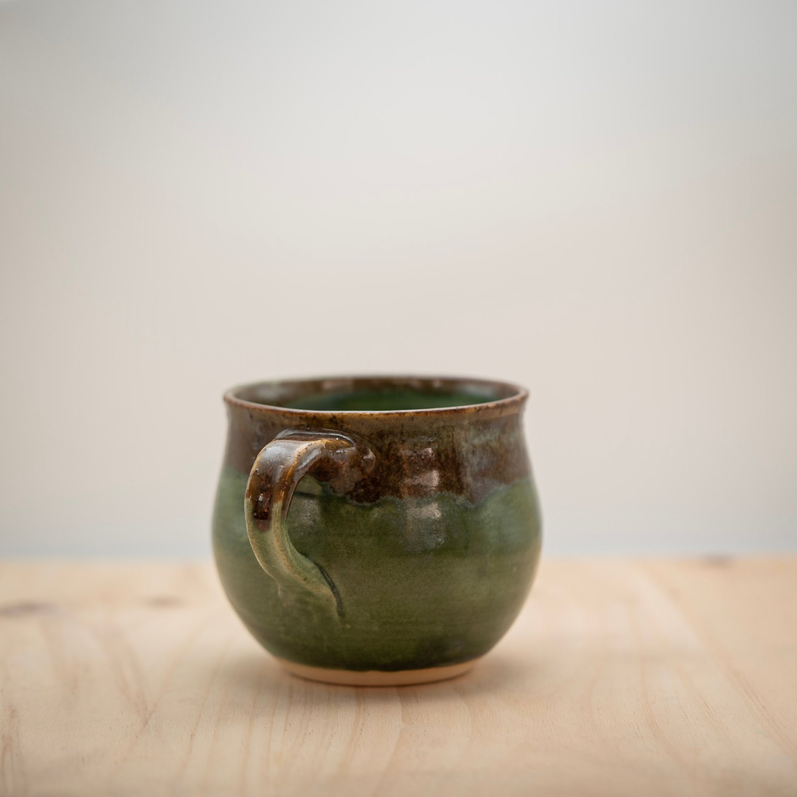 Esta taza la realizamos al torno con arcilla refractaria. La esmaltamos con una primera capa verde y una segunda capa roja aplicada únicamente en la parte superior.